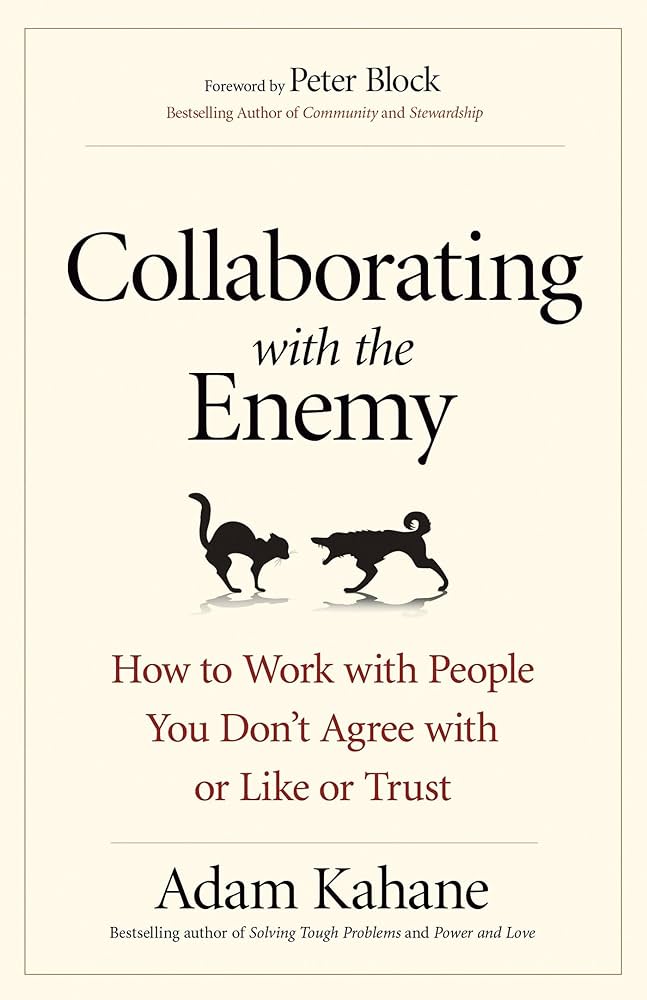 Given that we're operating in a time of divisiveness and increased fractures within society, I thought it would be good to re-read Adam Kahane's book Collaborating with the Enemy. It's endearingly penned "To my enemies and teachers." My recall of this book came from thinking about how collaboration functions, how to be more curious about opposing opinions, and what's possible when we dig our heels into the messiness of discourse. Kahane emphasizes that collaboration doesn't require agreement or trust but rather a willingness to work through differences to achieve common goals. I also like that the book encourages a mindset shift from seeing collaboration as a harmony-driven process to one that embraces conflict and uncertainty for innovative solutions.
